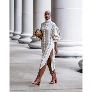 Elegant Cable Knit Casual Turtle Neck Puff Sleeve Knit Duster Long Sweater Dress Winter Maxi Dress