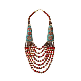 Long Layered Wooden Bead Necklace with Turquoise Mosaic