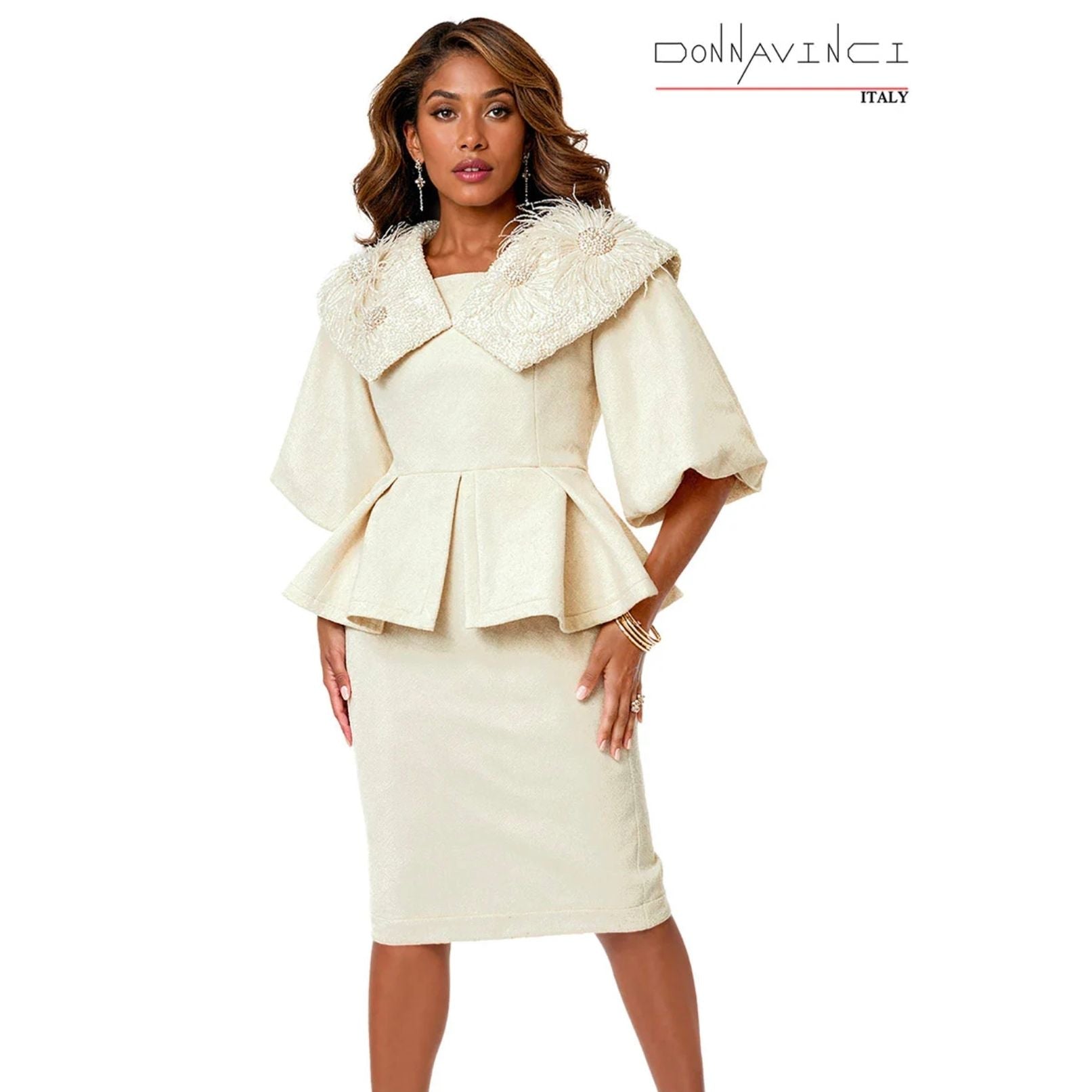 Donna Vinci 12245 | Embroidered Church Suit with Pearls & Feather Detail