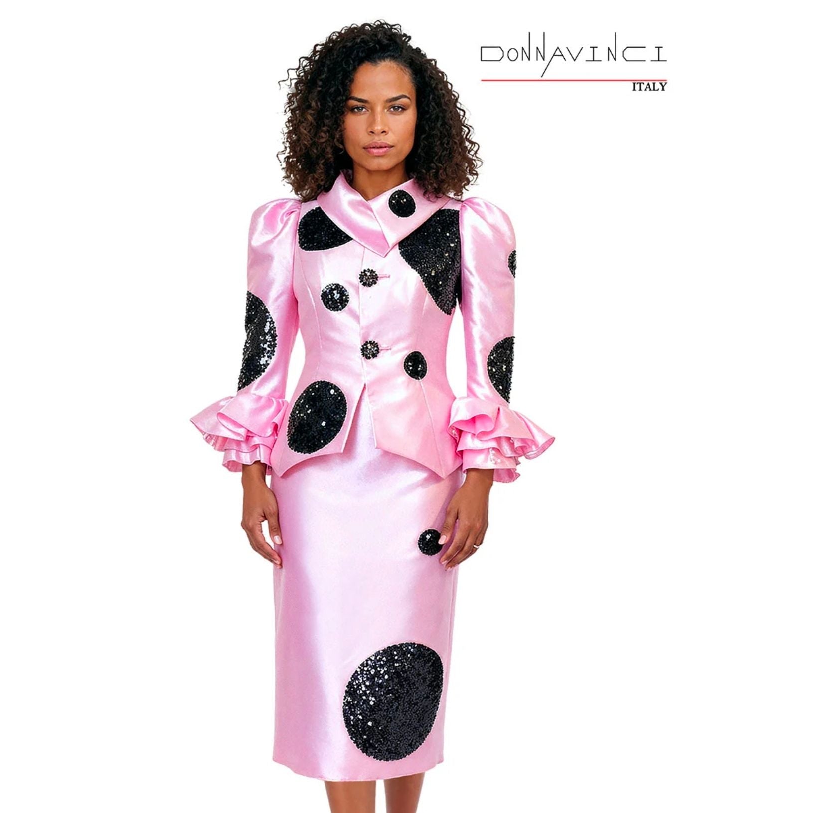Donna Vinci 12205 | Pink Black Sequin & Stone Button Skirt Suit